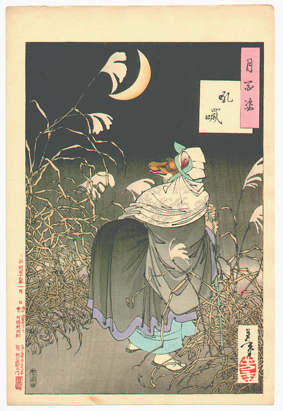 The fox (kitsune) was a creature thought by the Japanese to possess magical qualities. If a fox lived to a sufficient age, it gained the wisdom and power to shape-shift into a human form. In a popular Noh play, Konkaki, a fox disguised as a priest pays a visit to a hunter. Here, the fox is beginning to lose his human shape on a moonlit night. | |