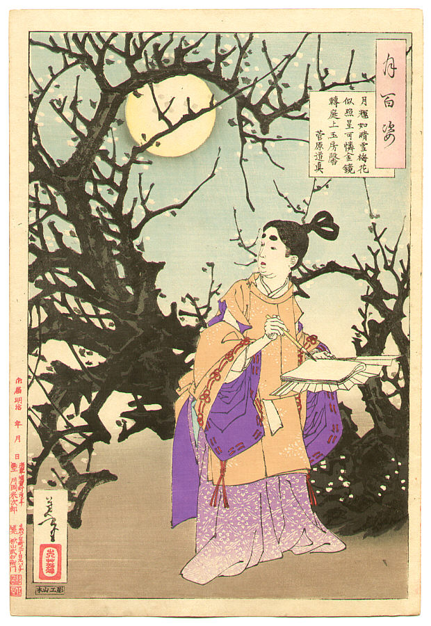 Sugawara no Michizane (845-903), also known as Kan Shōjō, was a well-regarded poet and politician at the Heian court. He wrote the poem on this print at age 11. The moon glimmers like bright snow The legend is that Michizane fell out of favor at the court, and died a lonely death. His vengeful spirit was unleashed on his enemies in the form of lightning storms. His rank was posthumously restored, and he was deified as Shinto god of scholarship, Tenjin ( V_). |