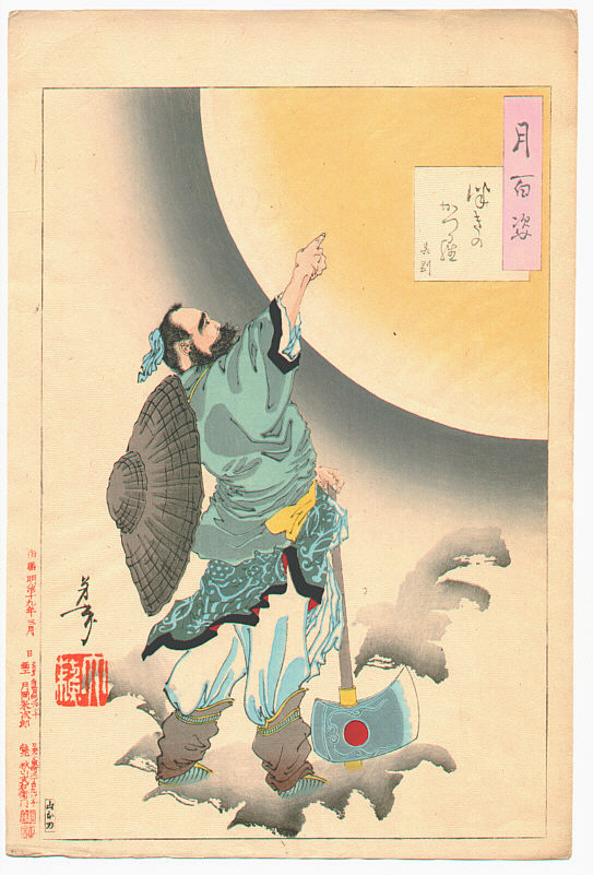 Wu Gang was a magician who attempted to use his Taoist magical powers to gain immortality. He was condemned to cut a 500 foot cassia (katsura) tree on the moon. He was told that if he could succeed in chopping down the tree he would be granted immortality. The tree, immortal itself, immediately grew back once cut. This tale (there are several versions) is still told today to chinese children during the Moon Festival. | |