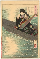 In 1185, the rivalry between the Minamoto (Genji) and Taira (Heike) clans was settled definatively in favor of the Minamoto at the naval battle of Dannoura. Minamoto no Yoshitsune was then set upon by his elder brother, Yoritomo in an internal battle for control of the county. Here, the hero Musashibō Benkei, follower of Yoshitsune, rides a boat during a violent storm. The legend is that the ghosts of defeated Heike warriors appeared, carrying out revenge upon the fleeing forces of Yoshitsune. | |