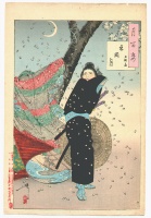 In 1582, Akechi Mitsuhide forced Oda Nobunaga to commit seppaku. His forces were then promptly routed by Hideyoshi at the Battle of Yamazaki (Tennozan). Mitsuhide fled, but was killed by a peasant militia near the village of Ogurusu. In this print, Mitsushide is horseback, under the moon. A peasant watches, planning the ambush. | |