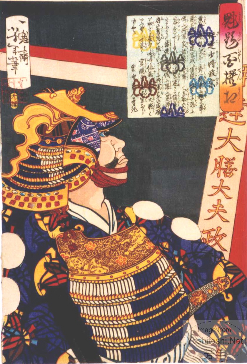 262KB | #37 | 1868 | 伊?達 少将 政宗 | Date Shōshō Masamune in armor looking at banner. | The first kanji is marked '?' because it can't be seen clearly in the image; it probably is the correct character, though, as sources confirm this is the one used in this name. |