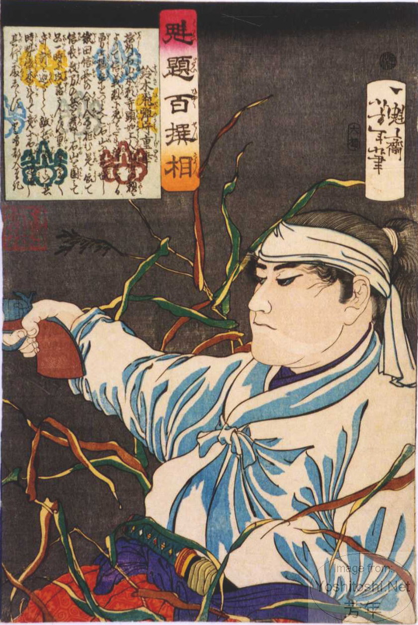 #45 | 1868 | 鈴木 孫市 | Suzuki Magoichi leaning on a spear and eating a riceball. | ||