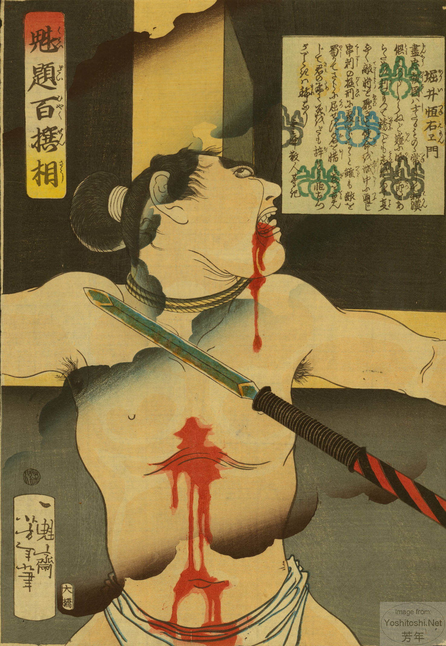 1062KB | #10 | 9/1868 | 冷泉 判官 隆豊 | Reizei Hangan Takatoyo | Normally known as Reizei Takatoyo, he is shown here dying from seppuku (ritual self-disembowelment). |